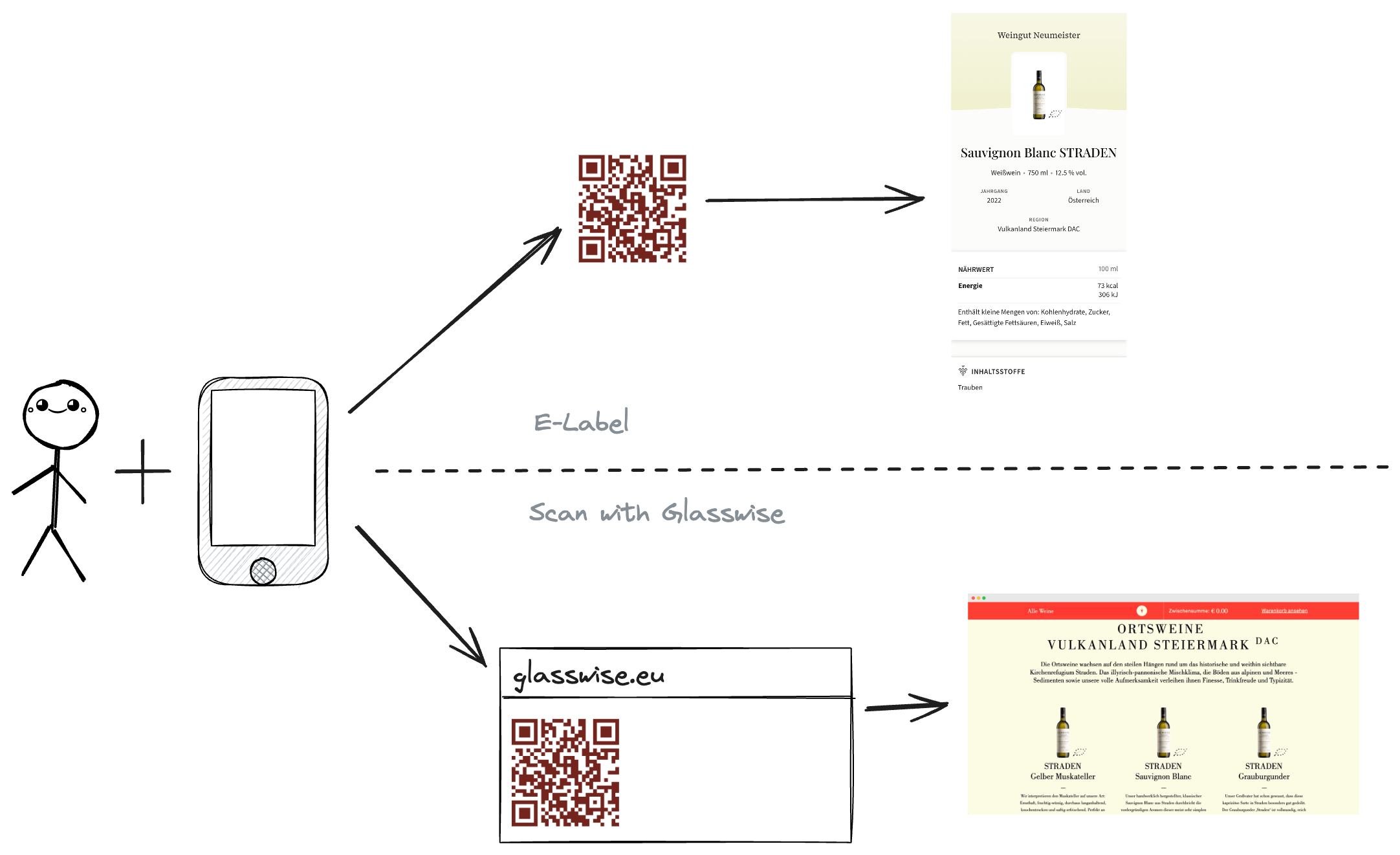 'Scan with Glasswise' enables a legally clean secondary use of the QR code. By scanning the QR code through the Glasswise website, the marketing and e-commerce prohibition does not apply. This allows for redirection to your winery's website, a direct link to your own shop, or to a retailer.